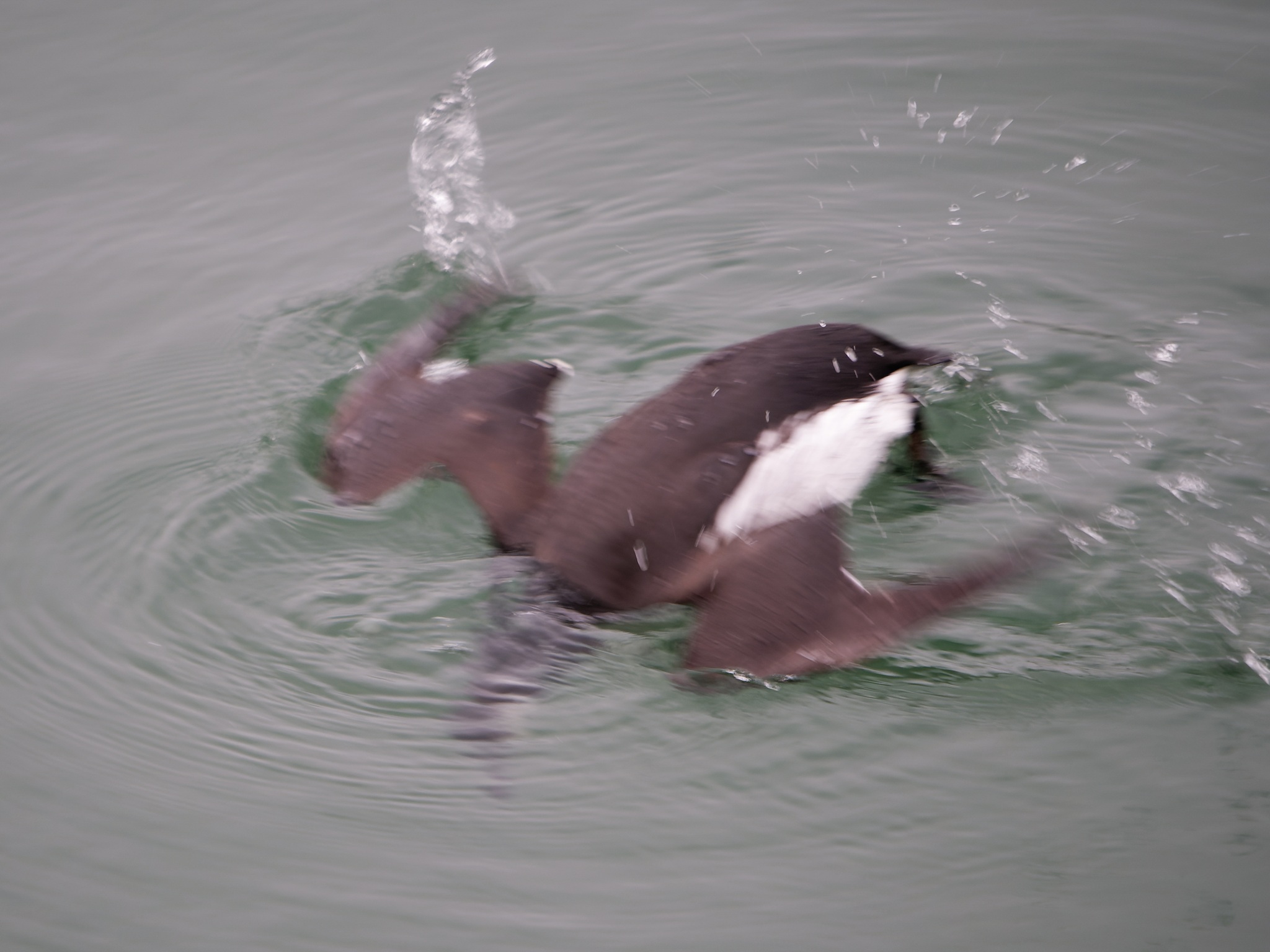 Vogel taucht ab. Trottellummen "fliegen" unter Wasser. Man sieht hier den ersten Schwimmstoß.