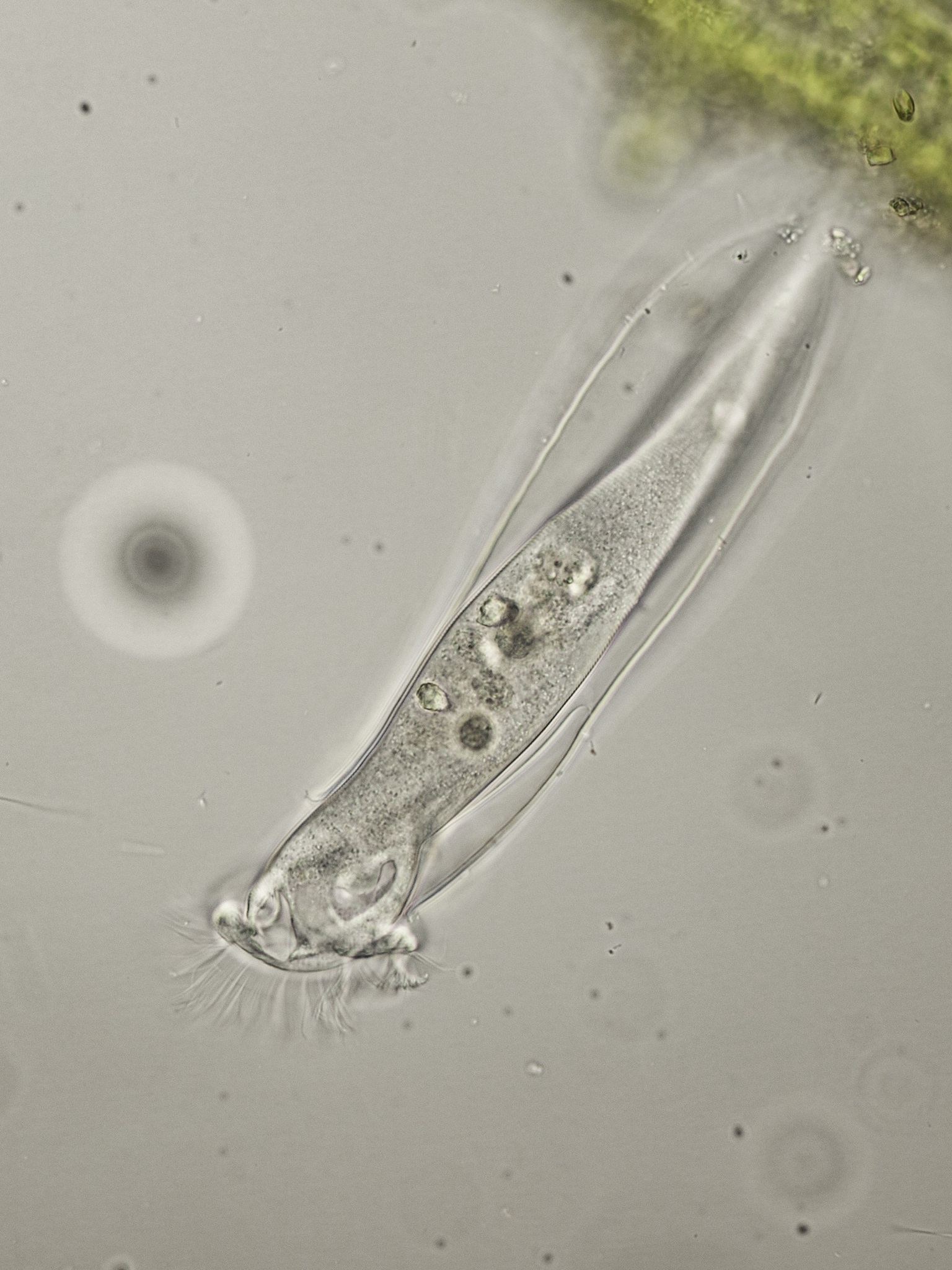 Ein kleiner Einzeller, wohl aus der Gruppe der Wimperntierchen, streckt sich aus seinem Häuschen, und strudelt Wasser auf der Suche nach Essbarem. Wird er dabei gestört, zieht es sich blitzartig in seine Hülle zurück. Dabei klappt die Tür zu. Nach einer Weile traut er sich wieder heraus. Dabei drückt er die Klappe von innen einfach wieder auf.