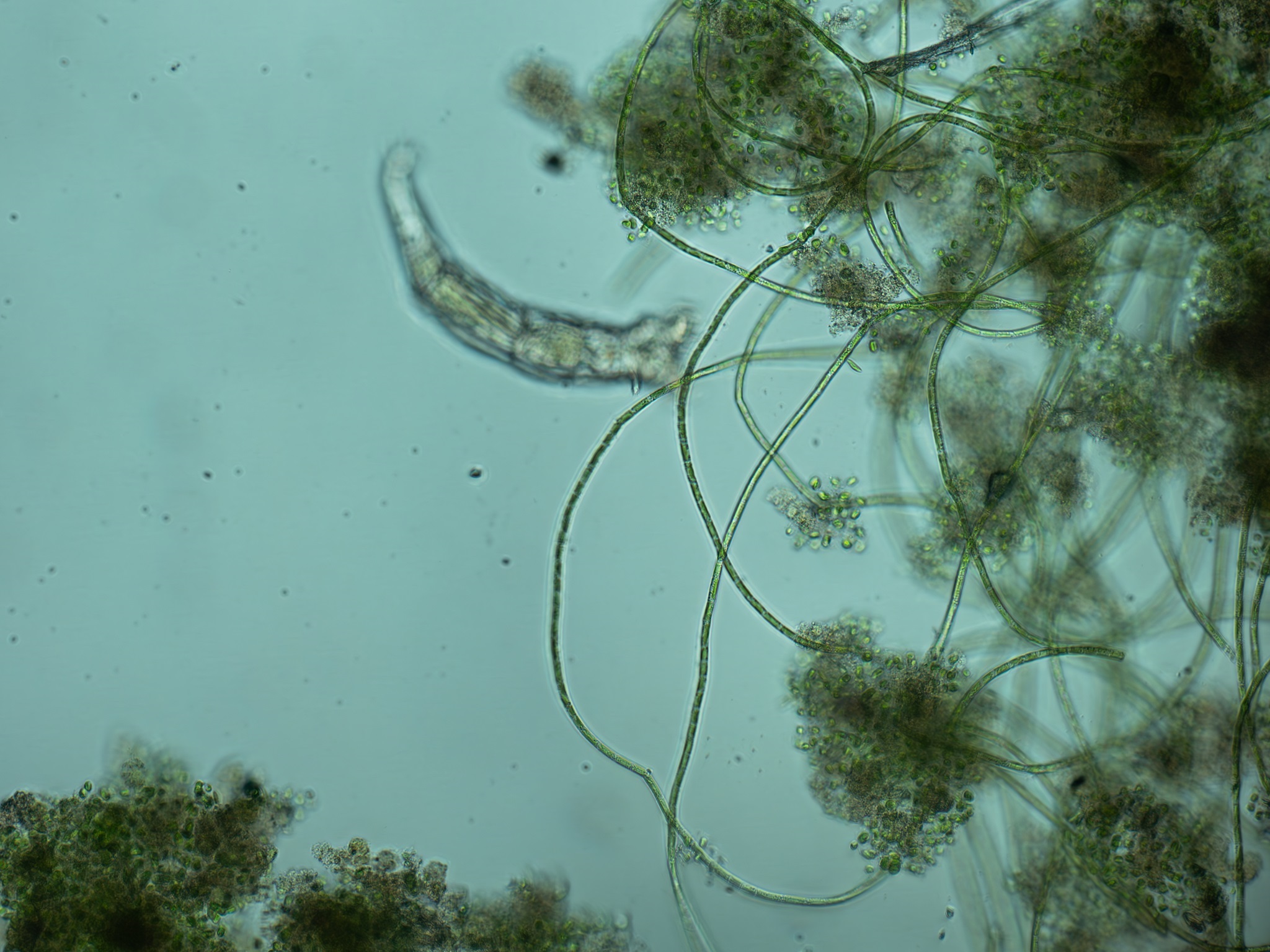 Die Cyanobakterien (Woronichinia spec.) bilden mit grünen fadenförmigen Algen recht feste Flocken. Diese werden von Rädertierchen beweidet.