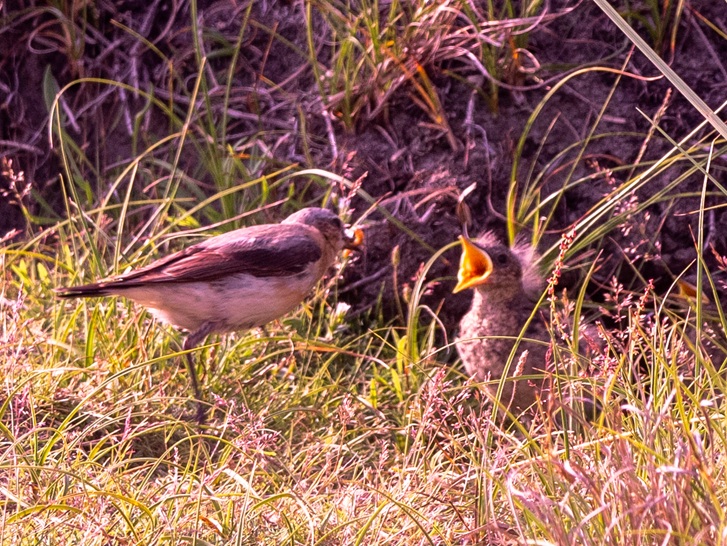 Weibchen füttert Junges vor Bruthöhle.
