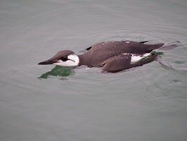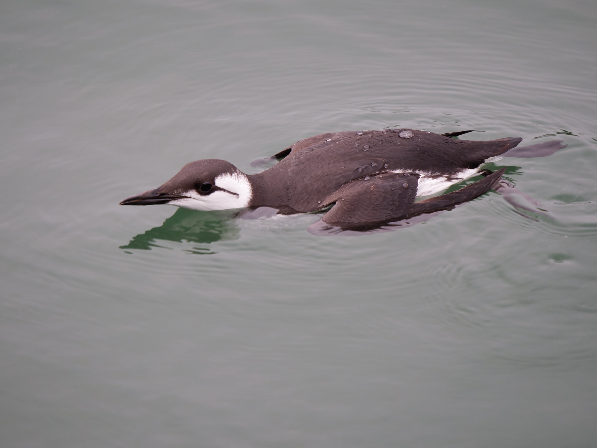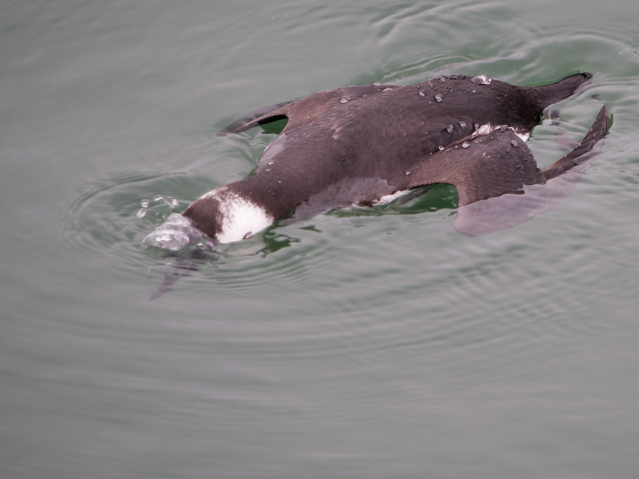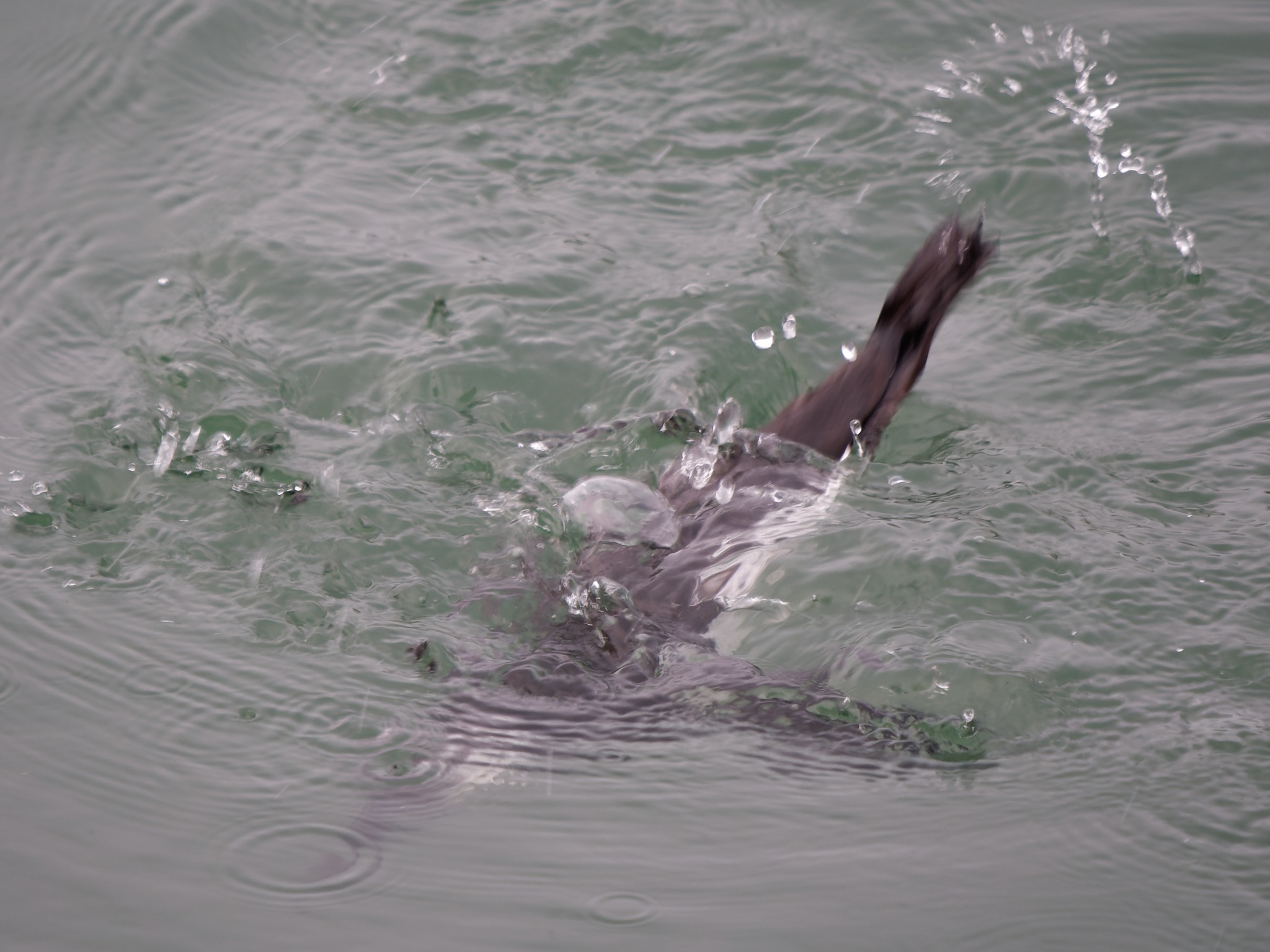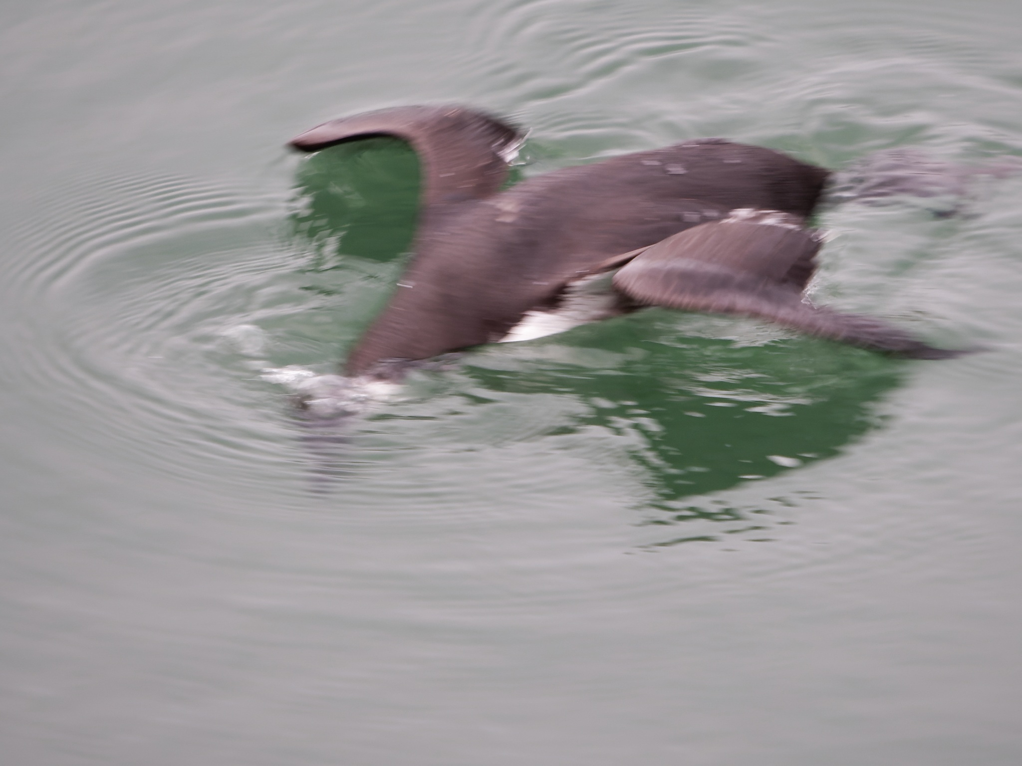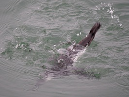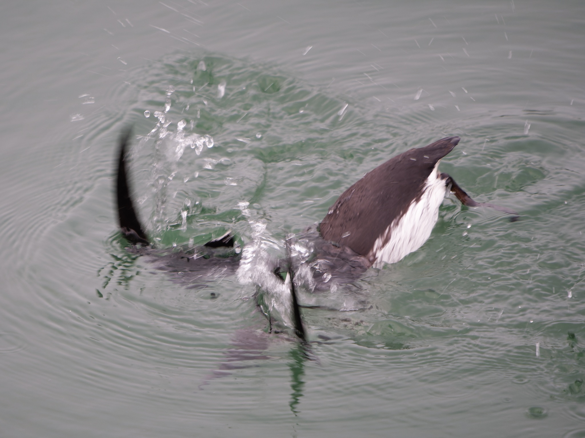 Vogel taucht ab. Trottellummen "fliegen" unter Wasser. Man sieht hier den ersten Schwimmstoß.